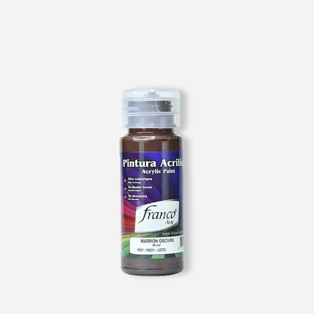La PINTURA ACRÍLICA FRANCO ARTE es una pintura a base de agua cuyos formadores de película son emulsiones acrílicas. Usos: Decora, protege o señala, materiales como: madera, MDF, yeso, cerámica, cartón, papel, icopor, paredes (interiores), entre otros. Características: NO TÓXICA, acabado liso, durable, no se decolora, lavable, alto rendimiento, buen cubrimiento, fácil aplicación, excelente adherencia, resistencia a la abrasión, entre otros.