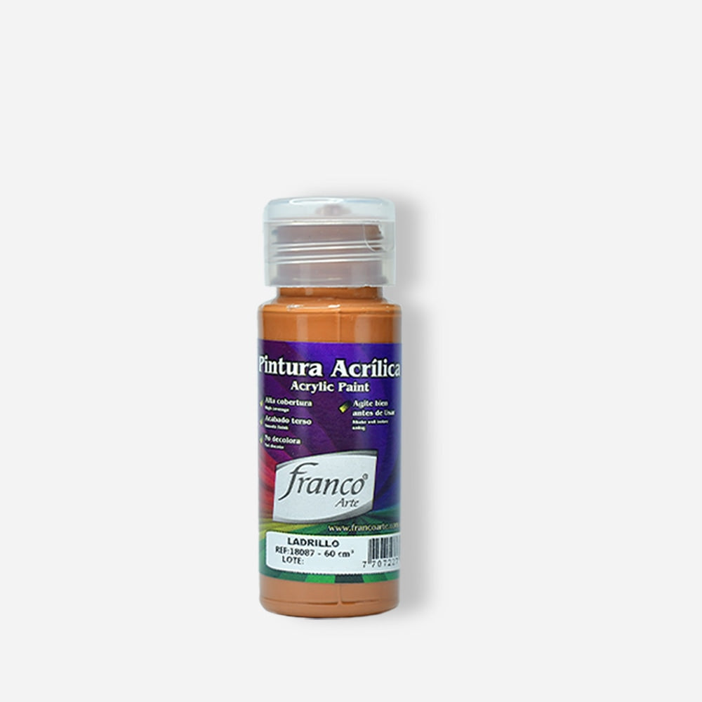 La PINTURA ACRÍLICA FRANCO ARTE es una pintura a base de agua cuyos formadores de película son emulsiones acrílicas. Usos: Decora, protege o señala, materiales como: madera, MDF, yeso, cerámica, cartón, papel, icopor, paredes (interiores), entre otros. Características: NO TÓXICA, acabado liso, durable, no se decolora, lavable, alto rendimiento, buen cubrimiento, fácil aplicación, excelente adherencia, resistencia a la abrasión, entre otros.