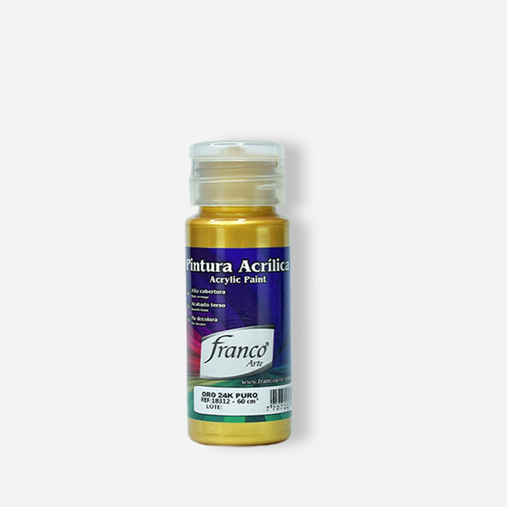 La PINTURA ACRÍLICA FRANCO ARTE es una pintura a base de agua cuyos formadores de película son emulsiones acrílicas. Usos: Decora, protege o señala, materiales como: madera, MDF, yeso, cerámica, cartón, papel, icopor, paredes (interiores), entre otros. Características: NO TÓXICA, acabado liso, durable, no se decolora, lavable, alto rendimiento, buen cubrimiento, fácil aplicación, excelente adherencia, resistencia a la abrasión, entre otros.