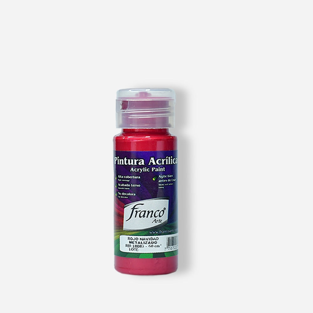 La PINTURA ACRÍLICA FRANCO ARTE es una pintura a base de agua cuyos formadores de película son emulsiones acrílicas. Usos: Decora, protege o señala, materiales como: madera, MDF, yeso, cerámica, cartón, papel, icopor, paredes (interiores), entre otros. Características: NO TÓXICA, acabado liso, durable, no se decolora, lavable, alto rendimiento, buen cubrimiento, fácil aplicación, excelente adherencia, resistencia a la abrasión, entre otros.