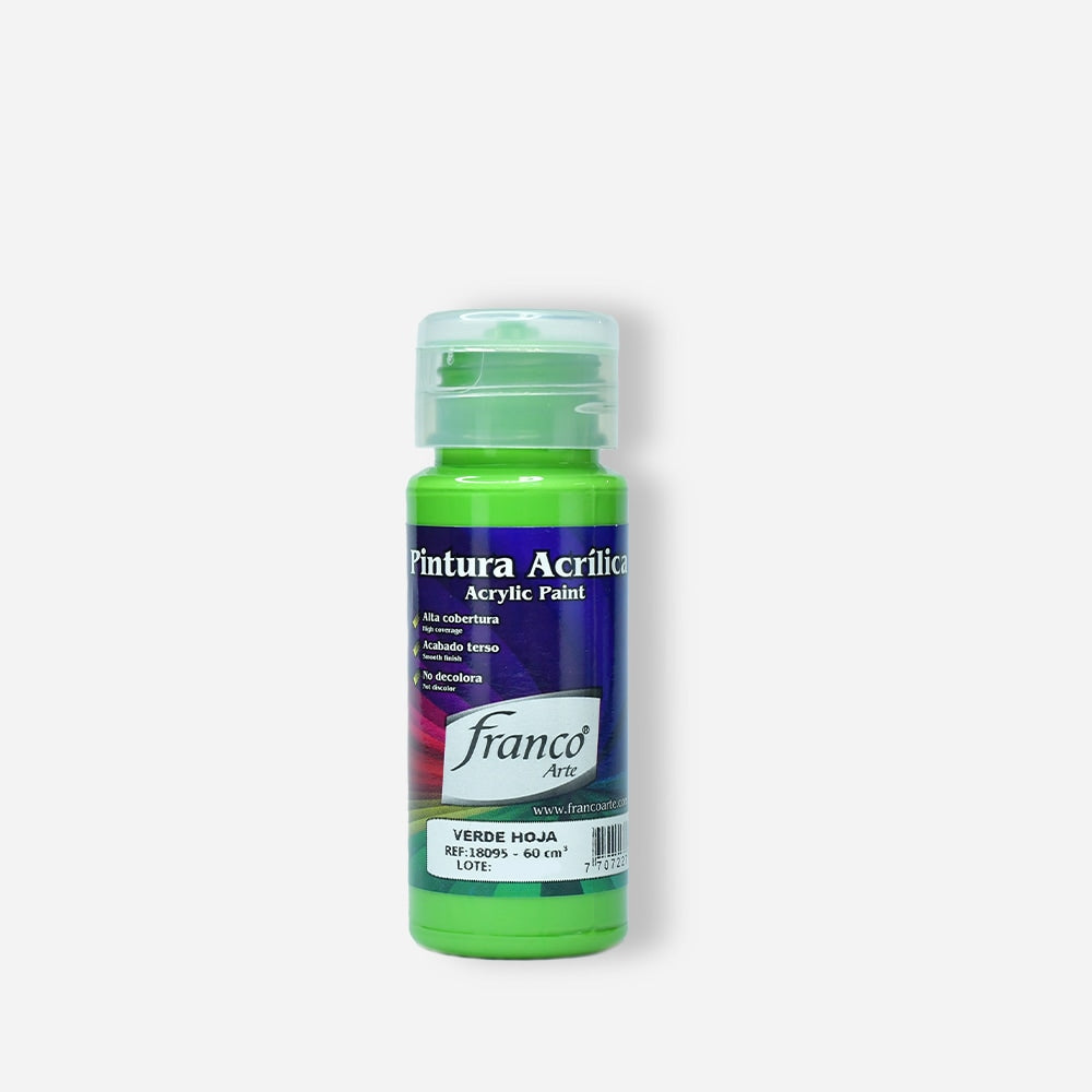 La PINTURA ACRÍLICA FRANCO ARTE es una pintura a base de agua cuyos formadores de película son emulsiones acrílicas. Usos: Decora, protege o señala, materiales como: madera, MDF, yeso, cerámica, cartón, papel, icopor, paredes (interiores), entre otros. Características: NO TÓXICA, acabado liso, durable, no se decolora, lavable, alto rendimiento, buen cubrimiento, fácil aplicación, excelente adherencia, resistencia a la abrasión, entre otros.